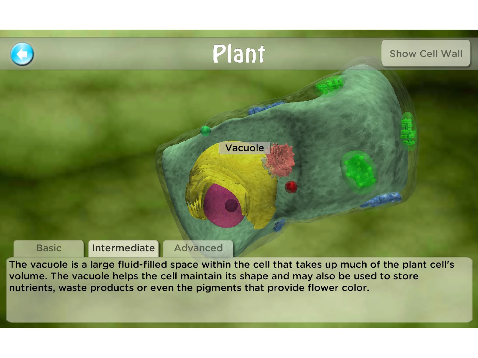 使用者可以用手指點擊細胞的不同部位來選擇並放大該特定的細胞器。 每個細胞器都有一個名稱和其功能的簡短描述。